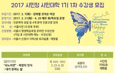 강    의  내    용 (3월23일-4월20일, 목2시) 1주 3월23일  자유롭고 싶은 삶, 권위, 가치와 자유 남이 만든 가치에 얽매어 있는 현실에서 벗어나는 5가지 삶의 소통 2주 3월30일  집착과 욕망의 철학  욕망은 무조건 나쁜가? 욕망을 이해하는 3가지 감정브릿지 3주  4월6일    외로움의 철학 외로움, 우울감, 이중성, 소극성(shy)에 대한 긍정적 철학 4주  4월13일    나는 개체인가 공동체 구성원인가 데카르트에서 알파고에 이르는 생명과 인식의 여정 5주  4월20일    서양의 존재론, 동양의 도덕론 > 플라톤과 공자, 존재란 무엇인가,  형이상학 없는 철학, 나는 왜 공부하나? 소중한 행복