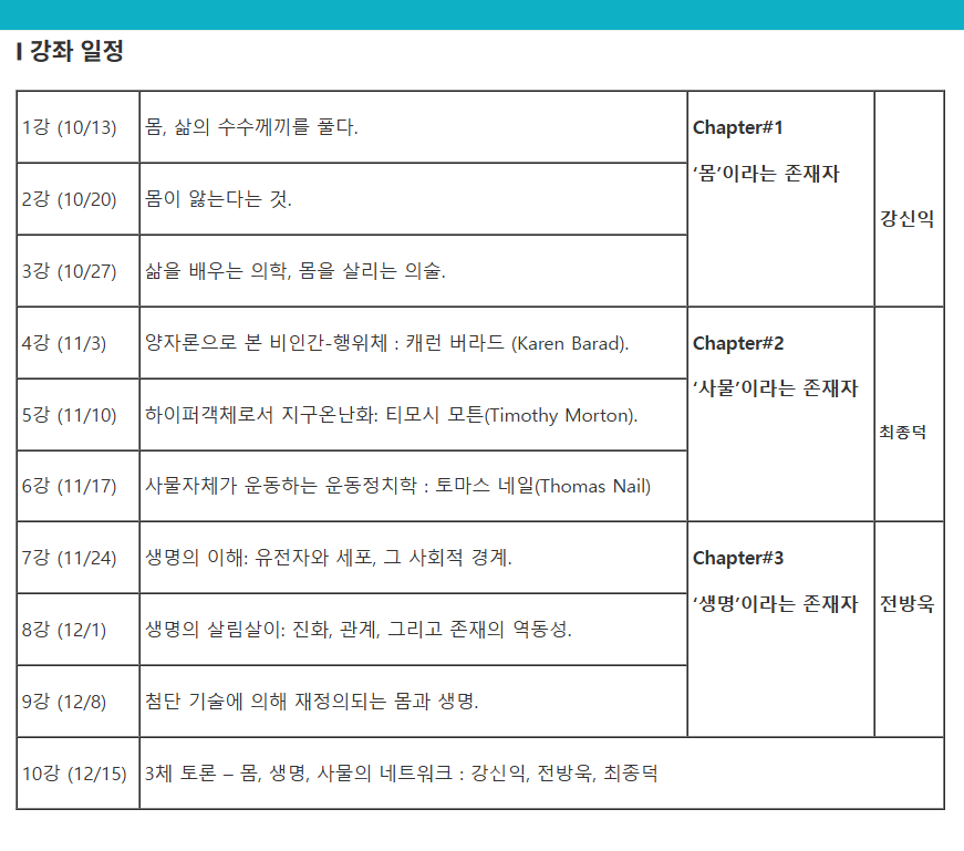 존재론(ontology)은 철학이라는 학문이 생겨나기 이전부터 인류에게 항상 던져졌던 물음이었습니다. 인류가 신화와 종교라는 믿음에서 벗어나는 순간부터 당연히 인간 그 자체에게 부여되었던, ‘과연, 존재한다는 것은 무엇인가?’라는 질문은 ‘인간’이라는 주체에서 시작하여 ‘객체/대상(object)’ 과의 관계에 대한 성찰속에 그 범위를 지속적으로 넓혀 왔습니다. 특히, 20세기에 시작된 비약적인 과학기술의 발전은 21세기 인류에게 지속 가능한 존재론적 철학을 요구하고 있습니다. 이런 철학적 ‘존재론’이 우리 생활 주변의 ‘존재자’에 대한 구체적인 생각을 담을 때, 우리의 사유는 더욱 풍부해지고 삶의 철학이 생겨납니다. 이번 강좌는 인간의 신체(몸)에 대한 탐구부터 시작하여, 자연의 생명에 대한 존재론적 의의 그리고, 최근의 신유물론으로 대변되는 기술적/물질적 존재들에 대한 철학적 사유를 알아보는 시간이 될 것입니다. 특히, 저마다의 분야에서 오랫동안 연구하며 공부하신 3분의 선생님이 함께 준비하신 ‘존재자’와 ‘존재론’에 대한 풍부하고 깊이 있는 연구는, 어찌됐든 ‘지구’라는 행성에서 살아가야 하는 우리에게 새로운 생각의 폭을 확장시켜 줄 것입니다.